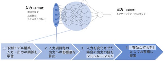 NTT ExCパートナーおよびNTT HumanEX(以下、NTT ExCパートナーグループ)では、ヒューマン・キャピタル(人的資源)分野におけるエンゲージメント向上に資する分析を積極的に行っており、データサイエンス・AI領域における国内最高水準の教育研究拠点を有し、データサイエンス分野における先進的な研究と社会実装に取り組んでいる滋賀大学と、分析精度の向上を目的とした技術連携を行ってきました。本手法では、滋賀大学と連携することで、技術的・理論的な裏付けを行います。従来は相関係数や重回帰分析のみで分析をおこなっておりましたが、AI・機械学習の手法を用いることで、非線形の関係性をモデル化します。このモデルを使用したシミュレーションを確認することで、重要な先行指標を特定し、さらには、先行指標の値を改善した場合にどれぐらいエンゲージメントの指標が改善するかを、定量的な予測にもとづいた分析が可能になります。
