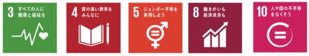 3.全ての人に健康と福祉を、4.質の高い教育をみんなに、5.ジェンダー平等を実現しよう、8.働きがいも経済成長も、10.人や国の不平等をなくそう