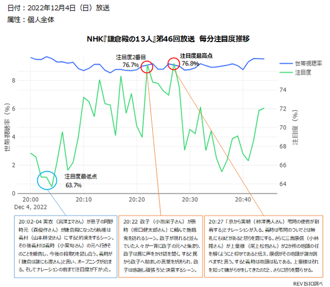12月4日に放送された第46回「将軍になった女」は、視聴者にどのように見られていたのでしょうか? テレビの視聴者の様子を、1分毎の「REVISIO推定視聴率」と、「テレビの前にいる人のうち、テレビ画面に視線を向けていた人の割合=注目度※」のグラフで見てみました。