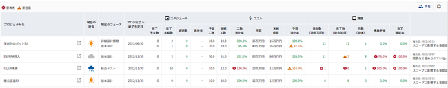 プロジェクトごとの状況把握に最低限必要なスケジュール・コスト・課題を一目で把握することができます。また、従来のダッシュボード画面を活用し、スケジュール・コスト・課題以外のプロジェクト情報(ToDo・変更・リスク・不具合)を定量確認することで、プロジェクト成功のために必要な分析や正しい意思決定をサポートします。