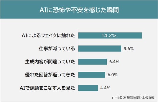 「AIに恐怖や不安を感じた瞬間」の1位は「AIによるフェイクに触れた(14.2%)」、2位は「仕事が減っている(9.6%)」でした。