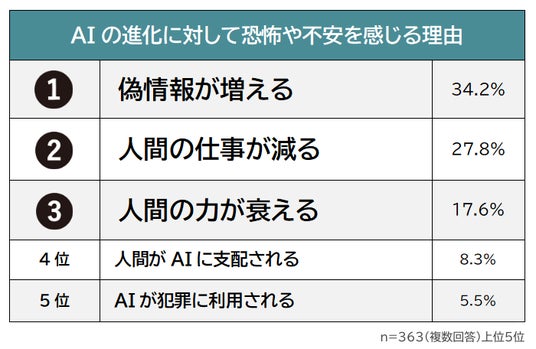 「AIの進化に対して恐怖や不安を感じる」と答えた363人に理由を聞いたところ、1位は「偽情報が増える(34.2%)」、2位は「人間の仕事が減る(27.8%)」、3位は「人間の力が衰える(17.6%)」でした。