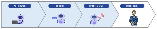 ■ 「FinchSales」が実現する営業BPRの全プロセス 「FinchSales」は、従来の営業フローを「リード探索」「最適化」「企業コンタクト」「提案・契約」の4フェーズに分解し、AIエージェントが各フェーズを自動処理します。