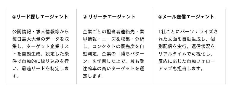 ■ 「FinchSales」の概要:A2Aアーキテクチャによる営業自動化 「FinchSales」の最大の特徴は、3つの専門AIエージェントが相互に連携して営業活動を代行する「A2A(Agent to Agent)アーキテクチャ」にあります。各エージェントは独立した専門性を持ちながら、シームレスに連携することで、従来は人手に頼っていた営業プロセス全体を自動化します。