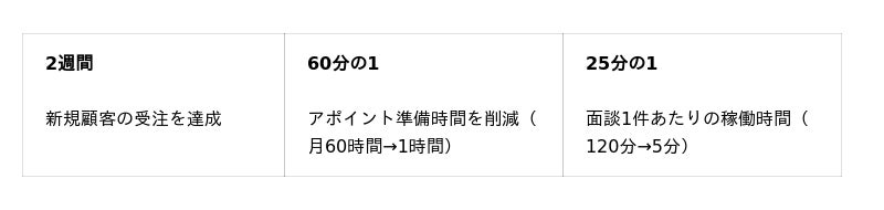 導入からわずか2週間で6件の商談を獲得し、新規受注を達成しました。1人あたりのアポイント準備時間(リスト作成・メール送信等)は月60時間から1時間へと60分の1に短縮できました。面談1件あたりの営業マンの稼働時間も平均120分から5分へと25分の1に削減され、営業担当者が本来集中すべき顧客への提案・クロージングに専念できる環境が実現しています。