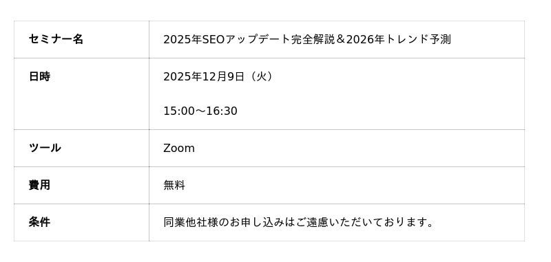 本セミナーでは、2025年の激動を総括し、2026年を先導するための具体的な戦略とインサイトを提供します。AI時代のSEOの変化点を「過去・現在・未来」の軸で一望できる、年末の戦略策定に最適な内容です。