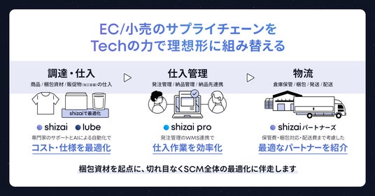 shizai社全体としては既存の包装資材プラットフォームに上記SaaSを加えるとともに、アライアンスパートナーとも連携し、在庫管理/保管/配送、などサプライチェーン全体に介在できる状態を作りつつあります。さまざまな角度でEC/小売事業者様のお力になれればと思います。