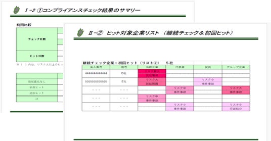 (1)定期的なレポート提供反社チェックファイルに保存された企業情報を、リスクモンスターが一括して再取得します。その後、前回実施時から反社チェックヒートマップの内容に変更があった取引先について、その概要をまとめたレポートをご提供します。