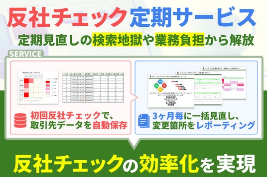 法人会員向けに与信管理クラウドサービスを提供するリスクモンスター株式会社(本社:東京都中央区、代表取締役社長:藤本太一)は、2024年8月22日(木)より、『反社チェック定期サービス』を提供開始することをお知らせいたします。