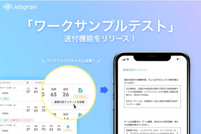グラム株式会社(本社:東京都渋谷区、代表取締役:小出悠人)は、当社が開発・運営する適性検査クラウドJobgram(ジョブグラム)において、仕事上のスキル・仕事の進め方を可視化し、採用選考の見極めをサポートする「ワークサンプル」機能をリリースしました。
