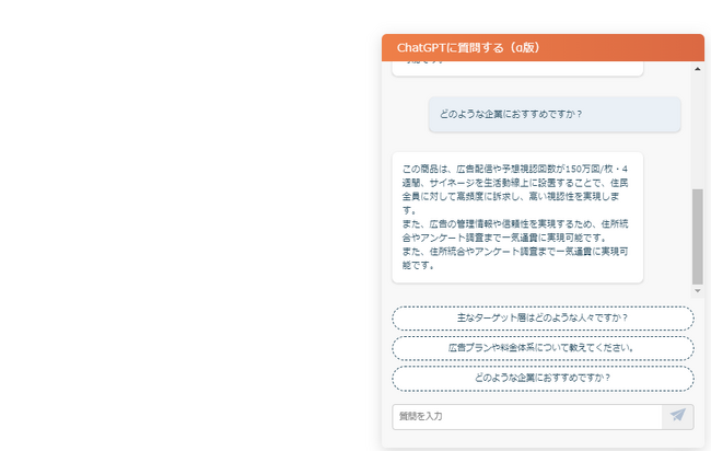 2. ユーザー:表示された「ChatGPTに質問する(α版)」のウィンドウに質問を入力。または、表示されている選択肢の中から確認したい条件に合うものをクリック。