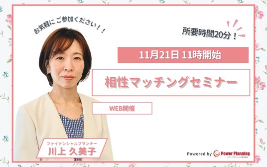 無料マネーセミナー提供サービス「アットセミナー」を運営しているパワープランニング株式会社が「11月21日 (木)11時」に川上 久美子講師によるオンラインの相性マッチングセミナー開催を実施いたします。