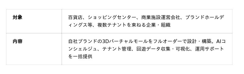 ■ 先行パートナー企業の募集についてスペースラボ株式会社では、「TALKABLE mall」システムの先行パートナー企業を2つのプランで募集します。自社ブランドのバーチャルモール構築を検討している百貨店・SC等の運営企業から、1ブランド・1店舗単位での導入を希望する企業まで、幅広くご相談を受け付けています。