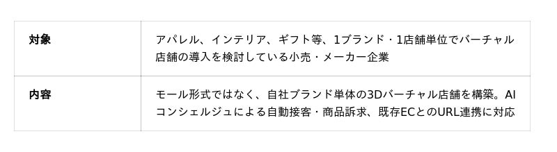 "プッシュ型の接客(声かけ・提案・気づきの提供)"がオンライン上で可能になります。加えて、実写寄りのリッチな3Dバーチャル空間と組み合わせることで、単なる商品一覧ではない"商空間の体験"を提供し、デジタルツインの商空間をオンライン上に構築することを目指します。