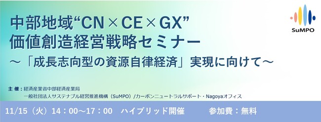 2022年11月15日(火) 一般社団法人サステナブル経営推進機構(東京都千代田区、代表理事:壁谷武久、以下、「SuMPO(さんぽ)」という。)は経済産業省中部経済産業局との共催で「中部地域”CN×CE×GX”価値創造経営戦略セミナー ~『成長志向型の資源自律経済』実現に向けて~」を開催致します。