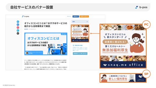 寄稿いただいた記事内では、自社サービスのバナーの設置が可能です。PC・スマホともに記事閲覧中に追従するバナーを設置することで、記事閲覧者へ自社の認知獲得、サービスサイトへの遷移促進を行うことができます。