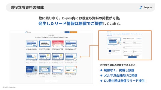 お役立ち資料は数に制限なく掲載が可能です。掲載いただいた資料をb-pos会員向けのメルマガで配信することで自社ではリーチできない層に対してのアプローチを実現。資料ダウンロード発生時は、リード情報を無償でご提供しています。