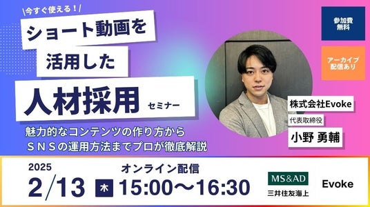 三井住友海上火災保険株式会社(取締役社長:舩曵 真一郎)は、株式会社Evoke(代表取締役:小野 勇輔)をゲストに迎え、全国の企業を対象としたオンラインセミナー「今すぐ使える!ショート動画を活用した人材採用 ~魅力的なコンテンツの作り方からSNSの運用方法までプロが徹底解説~」を2月13日(木)に開催します。
