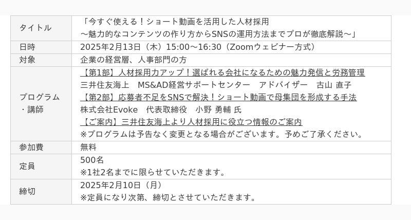 三井住友海上火災保険株式会社(取締役社長:舩曵 真一郎)は、全国の企業を対象としたオンラインセミナー「今すぐ使える!ショート動画を活用した人材採用」を2月13日(木)に開催します。