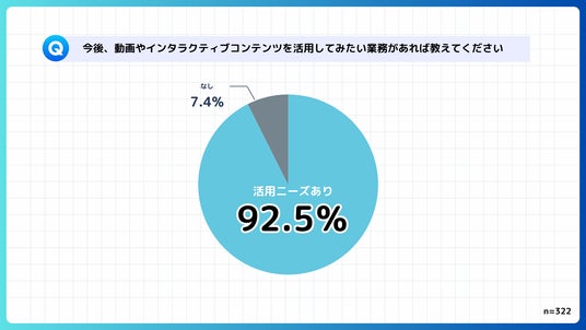 Q今後、動画やインタラクティブコンテンツを活用してみたい業務があれば教えてください」(n=322)と質問したところ、