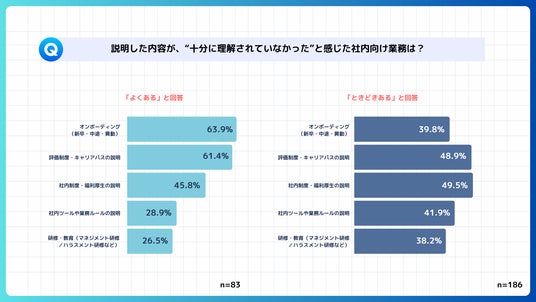 社内向けの人事業務に関して、「説明が十分に伝わらなかった」と感じた業務として最も多く挙がったのは、「よくある」と回答した人の中では「社員オンボーディング」(63.9%)、「ときどきある」と回答した人の中では、「社内制度・福利厚生の説明」(49.5%)や「評価制度・キャリアパスの説明」(48.9%)が上位に挙がりました。