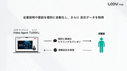 LOOV(ルーブ)は、AIを活用した「Video Agent」で、採用活動や人事業務を含む幅広い場面で活用できます。視聴者(候補者や社員など)の属性や興味関心に応じて、プレゼンや解説の内容を自動で最適化できるのが特徴です。人事担当者はこれにより、説明やプレゼンの工数を削減しつつ、視聴データの取得・活用によってHR業務全体の効率化と質の向上を図れます。