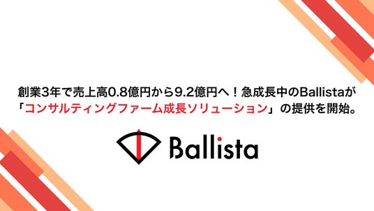 株式会社Ballista(本社:東京都千代田区、代表取締役社長:中川貴登、以下 Ballista)は、わずか3年で売上高を0.8億円から5.6億円、そして9.2億円へと急拡大させ、その急成長の秘訣を凝縮した「コンサルティングファーム成長ソリューション」の提供を開始いたしました。