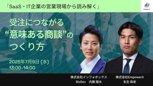 クライアントの事業成長に営業支援で伴走する株式会社EmpowerX(本社:東京都品川区、代表取締役:大野 将也)は、営業データプラットフォームを提供する株式会社インフォボックス(本社:東京都千代田区、代表取締役:平沼海統)と共催で、オンラインセミナー「受注につながる意味のある商談の作り方」を開催しました。本セミナーでは、変化する顧客の購買行動や営業現場の課題に対し、再現性の高い営業戦略を構築するための具体的なノウハウを共有し、多くの参加者にご好評をいただきました。