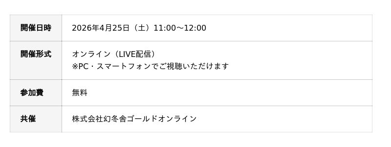 株式会社セレ コーポレーション(本社:東京都中央区、代表取締役 社長執行役員:山口 貴載)は、株式会社幻冬舎ゴールドオンラインとの共催により、2026年4月25日(土)11:00~12:00、無料オンラインセミナー「相続対策で後悔する人・しない人の違いとは~税理士が解説する資産承継の注意点と将来を見据えたアパート活用のヒント」を開催します。