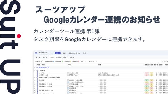 この度、株式会社スーツ(所在地:東京都千代田区、代表取締役社長CEO:小松 裕介)は、チームでかんたん、毎日続けられるプロジェクト・タスク管理ツールの経営支援クラウド「Suit UP」(スーツアップ)がカレンダーツール「Googleカレンダー」と連携したことをお知らせします。