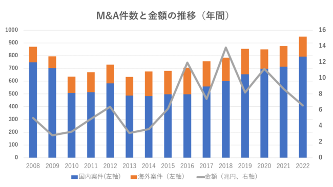2022年のM&A件数(適時開示ベース)は前年比8.2%増の949件と、2021年(877件)に記録したリーマン・ショック(2008年)後の最多を大幅に更新しました。