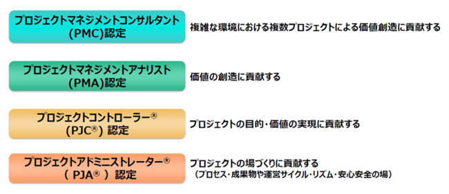 現在「PMA認定」「PJC(R)認定」「PJA(R)認定」の3つのレベルを提供し、指定の研修を受講し認定試験に合格した方を、対象レベルとして認定します。