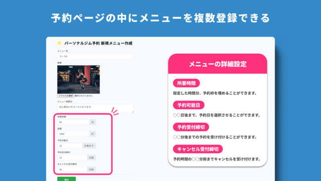 「所要時間」「予約可能日」「予約受付締切」「キャンセル受付締切」など、予約条件を細かく設定することも可能です。