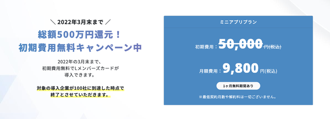 総額500万円還元キャンペーンを実施しており、先着100社様限定で初期費用(50,000円)を無料で提供させていただきます。(※2022年4月現在もキャンペーン延長中)