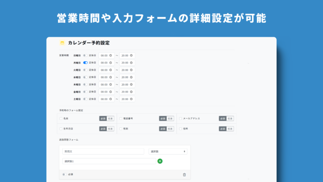店舗の営業日と営業時間を設定することが可能です。これにより、定休日に予約されてしまう事態を防ぐことができます。また、予約時に収集したい顧客情報に合わせて、予約時の入力フォームを詳細にカスタマイズする機能もございます。