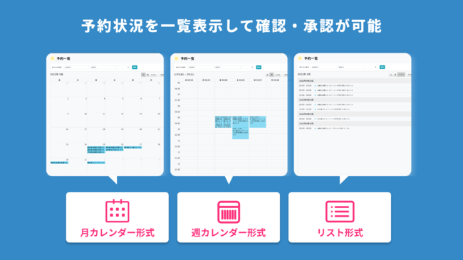 お客様の予約状況を一覧表示することが可能です。表示形式は「月単位カレンダー」「週単位カレンダー」「リスト」に対応しています。