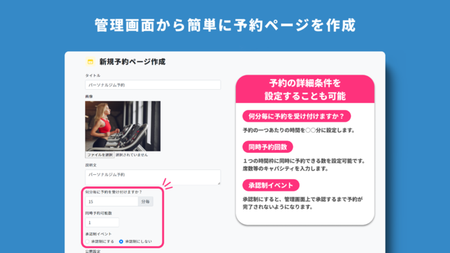 「予約時の時刻から○○分後以降の時間を選択させる」「1つの時間枠に同時に予約できる数を設定する」「予約を承認制にする」など、予約条件を細かく設定することも可能です。