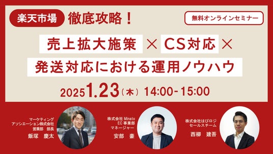 マーケティング支援を専門とする株式会社Minato(本社:東京都港区、代表取締役CEO:山崎雄太)は、マーケティングアソシエーション株式会社(本社:東京都台東区、代表取締役:中園広和)と株式会社はぴロジ(本社:東京都港区、代表取締役:森憲史)と3社共同で、『楽天市場徹底攻略!売上拡大施策×CS対応×発送対応における運用ノウハウ』をテーマに、2025年1月23日(木)14時より無料オンラインセミナーを開催いたします。EC事業部マネージャーの安部豪が「【今日から出来る】楽天市場売上向上のための15の具体施策」をテーマに登壇いたします。