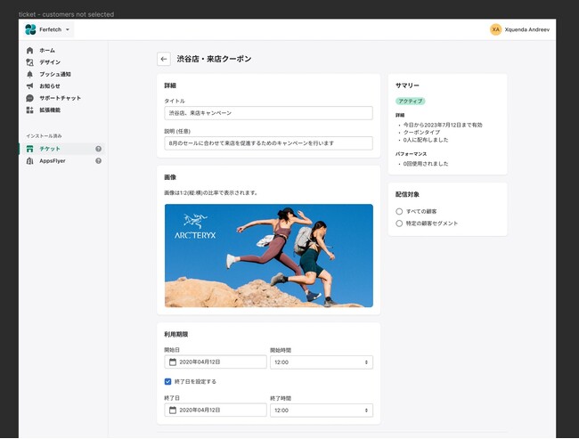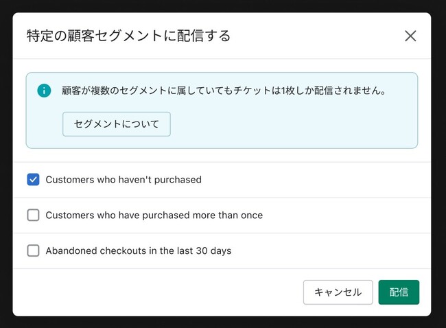 チケットはShopifの顧客セグメントを指定して配信が可能です。