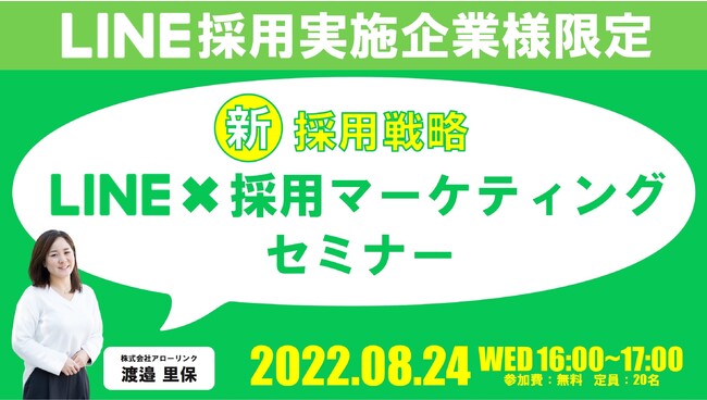 株式会社アローリンク(本社:兵庫県神戸市、代表取締役:蓬莱和真)は、8/24(水)にLINE採用実施企業様限定のオンラインセミナーを無料で開催します。「新採用戦略・即実践・LINE×採用マーケティング セミナー」と題し、コロナ禍に最適な"LINEを活用した採用戦略"について詳しくお伝えします。