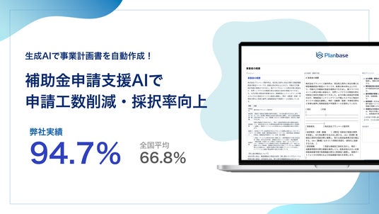 株式会社プランベース(本社:東京都新宿区、代表取締役:武衣 貴志)は、生成AIを組み込んだ自社開発アプリケーション「AI補助金コンサルくん」により、3次省力化投資補助金(一般型)において採択率94.7%(全国平均66.8%)を達成しました。