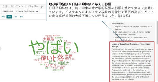 「日経平均株価」というキーワードで2024年4月19日のソーシャルメディアにおける投稿を抽出し、AI Summaryで要約した結果です。ワードクラウドでは「やばい」「下落」「酷い」等の投稿が確認できますが、AI Summaryはこれらのワードが投稿されている理由にも着目。4月19日の日経平均株価は中東情勢に対する懸念から2カ月ぶりの大幅な安値を付けましたが、暴落理由にも触れながら投稿の要約を行ってくれます。