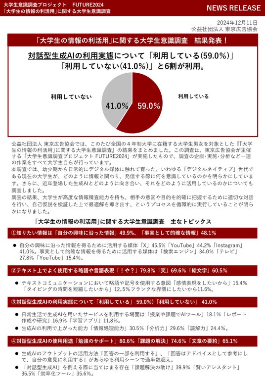 公益社団法人 東京広告協会では、このたび全国の4年制大学に在籍する大学生男女を対象とした『「大学生の情報の利活用」に関する大学生意識調査』の結果をまとめました。この調査は、東京広告協会が主催する「大学生意識調査プロジェクト FUTURE2024」が実施したもので、調査の企画・実施・分析など一連の作業をすべて大学生自らが行っています。