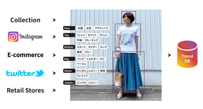 ニューロープは大手ECモールやInstagram、ファッションコレクションなどの画像データを収集し、独自に開発しているファッション特化の画像解析AIで解析、データベースを構築しています。