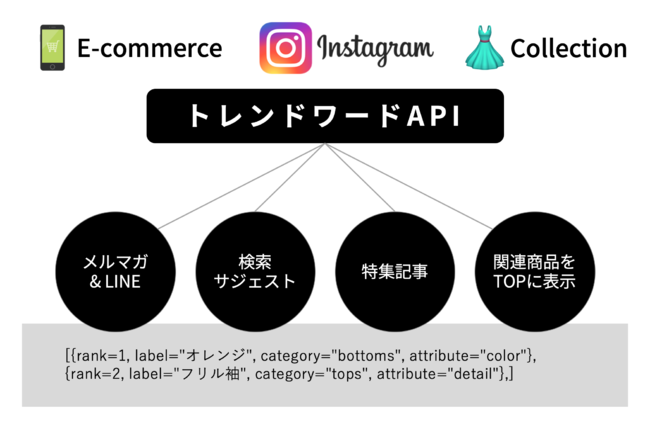 トレンドワードAPIは、大手ECモールやInstagram、ファッションコレクションなどのトレンドを反映させて、旬なキーワードの一覧を出力します。キーワードの内容はトレンドの変遷に合わせて自動的に更新されていきます。