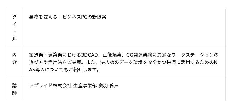 - (主催):アプライド株式会社 広域システム営業部 / 特機営業部 / SI営業部