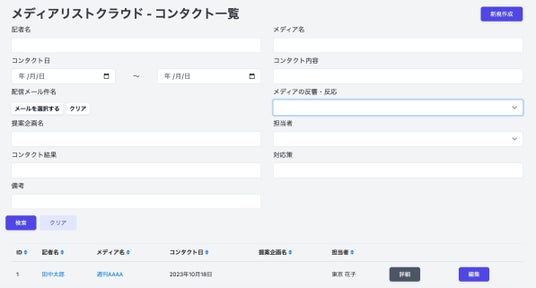 自社に関係する記者データ(連絡先やSNSアカウント、記者とのコンタクト履歴や過去記事等)を入力し、閲覧できる機能です。記者に関する情報を細かく入力することやタグ付けするなど、記者との関係性を細かく管理することで、記者データを経営資産として活用できます。2.配信リストのセグメント管理