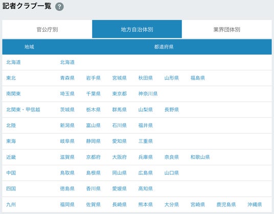 ・官公庁などに設置された記者クラブにプレスリリースを投函することで記者に情報が届くが、PRONE(プロネ)は全国に約500カ所存在する記者クラブを「官公庁」「都道府県」「業界団体」の3つのカテゴリー別に一覧表示、連絡先や投函方法など詳細が閲覧できる