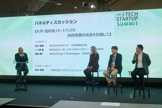 今回のパネルディスカッションでは、「大学・国研発スタートアップの持続発展的成長」をテーマに、パネラーとして登壇された大学機関・国研発のスタートアップ2社(株式会社カーボンクライオキャプチャー・株式会社Type-I Technologies)の起業背景や直面する経営課題を共有。ベンチャー経営と上場経験を持つ株式会社オキサイドの古川氏の見解を交えながら、アカデミアの評価軸と事業化のギャップをどう埋めて「売れる製品」を早期に創出するか、事業の成長局面に合わせた経営人材の獲得戦略、ディープテック分野におけるエコシステムの活用や資金調達をどんな戦略で行っていくべきかなどを議論しました。