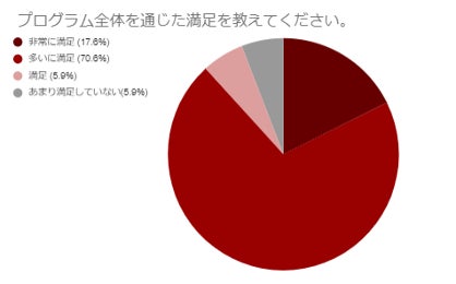 参加者アンケートでは80%以上が「プログラムでの学びや気付きが非常にあった/多くあった」と回答。また、90%以上が「プログラムは非常に満足/多いに満足」だと答えました。(以下、アンケートより作成。回答者数17)